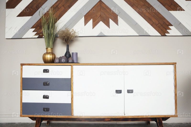 Часть интерьера комнаты с деревянным комодом, винтажными вазами