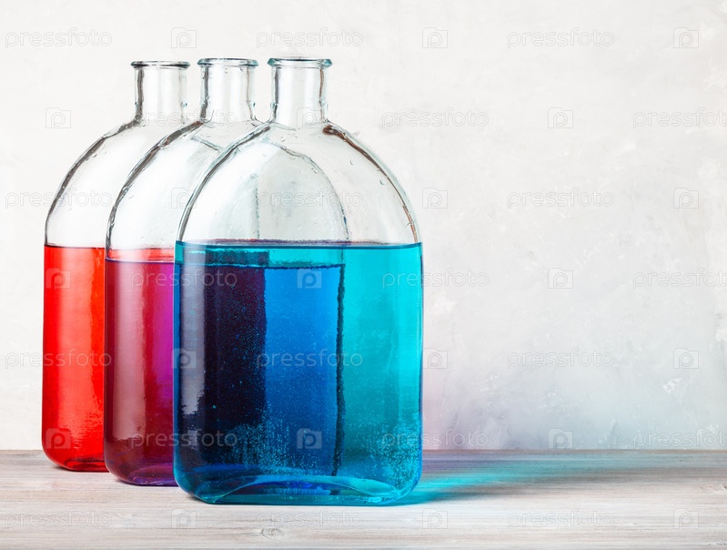 Три колбы с растворами цветных чернил на сером