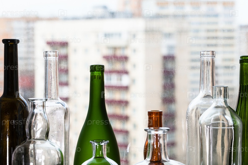 Различные пустые бутылки и вид на многоквартирные дома