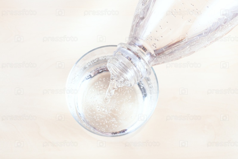 Лить воду из прозрачной пластиковой бутылки в стакан