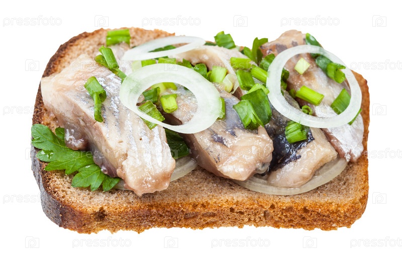 Открытый бутерброд с соленой сельдью и луком изолирован