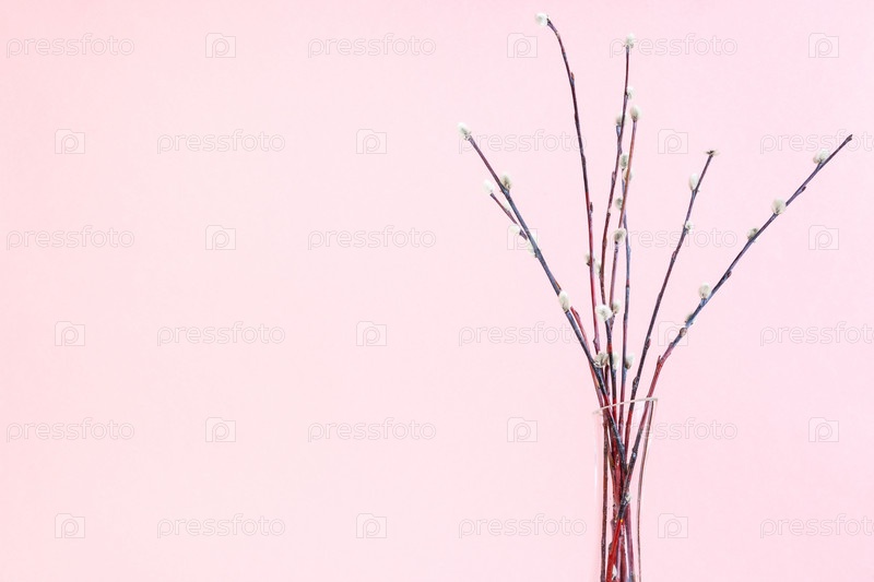 Пучок цветущей вербы в вазе на розовом