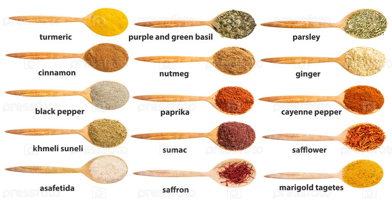 Вид сверху на деревянную ложку с различными молотыми специями