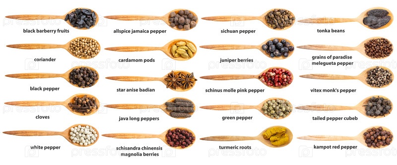 Набор деревянных ложек с различными специями, вид сверху