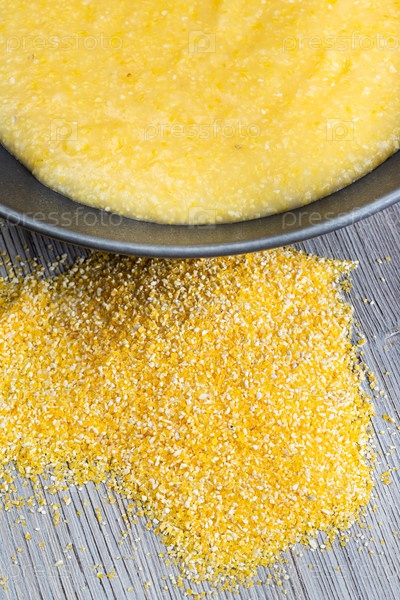 Горсть кукурузной муки и приготовленная кукурузная каша
