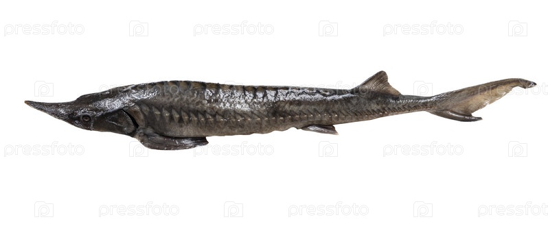 Вид сбоку на свежую осетровую рыбу, выделенную на белом