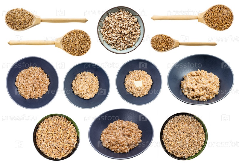 Набор различных вареных и сырых зерен пшеницы эммер