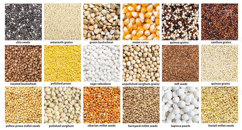 Различные мелкие зерна с названиями крупным планом