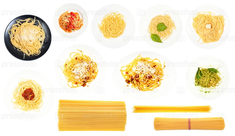 Набор различных вареных и сухих спагетти изолирован