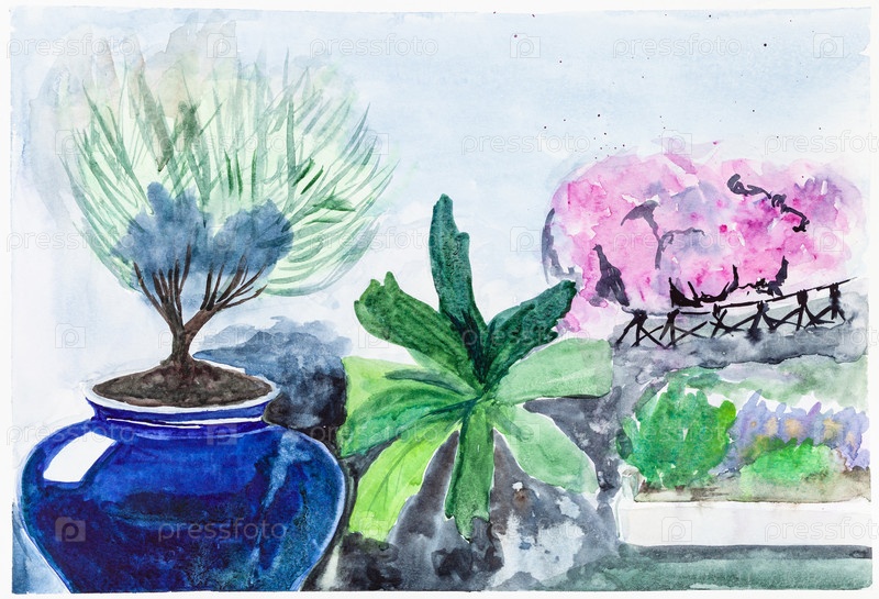 Вазон с деревом и видом на цветущий сад