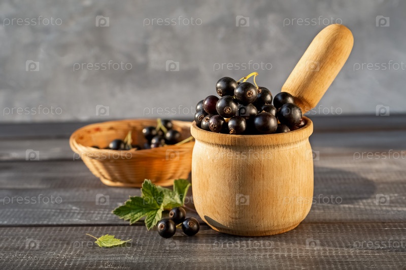 Спелая черная смородина в ступке и в плетеной тарелке для приготовления варенья на деревянном столе на закате с ветками и листьями