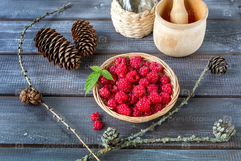 Свежая малина в плетеной корзине для приготовления варенья и даров леса - шишки, ветки на деревянном столе
