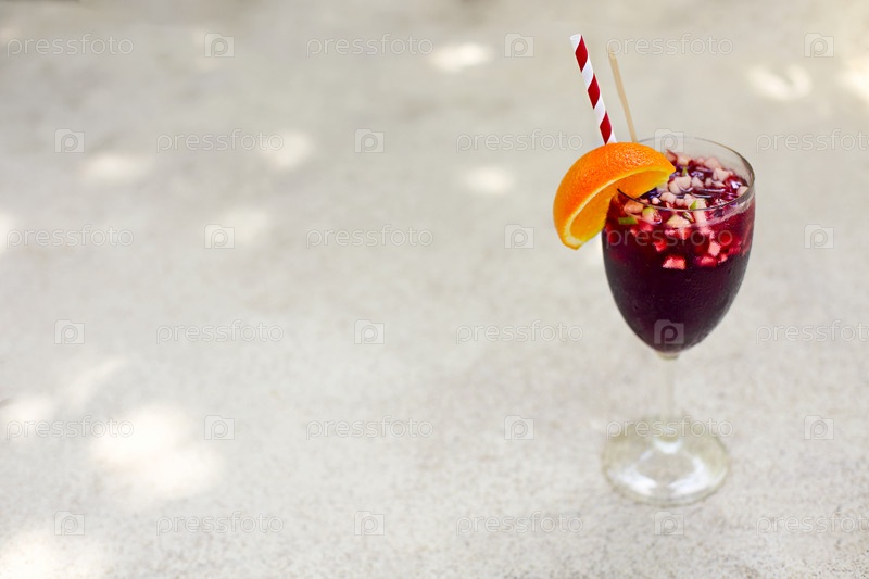 Стакан ледяной сангрии с клубникой, апельсином, яблоком и лимоном на столе. Крупным планом