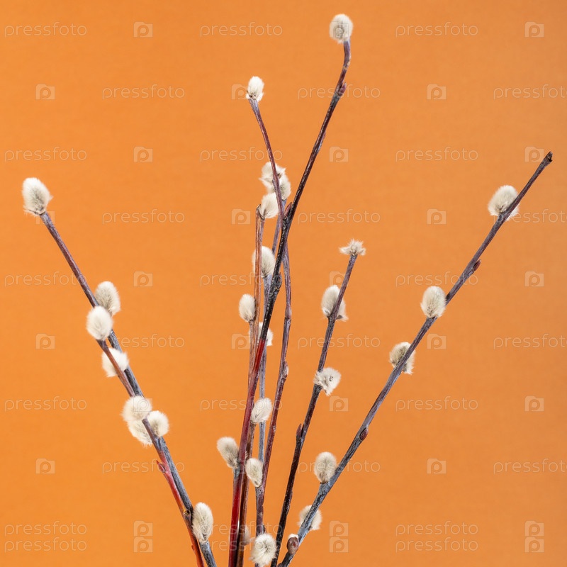 Цветущие веточки вербы на оранжево-коричневом фоне