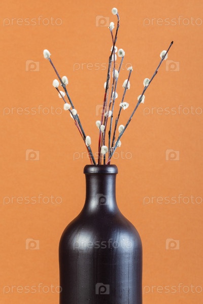 Веточки вербы в керамической бутылке на коричневом фоне