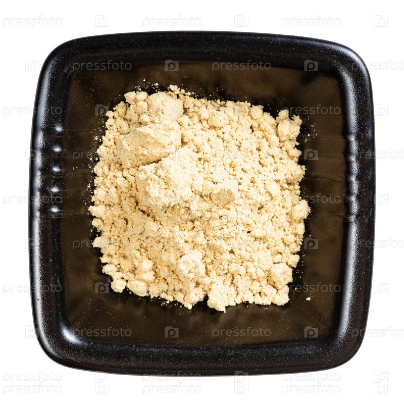 Вид сверху имбирного порошка в черной миске изолирован