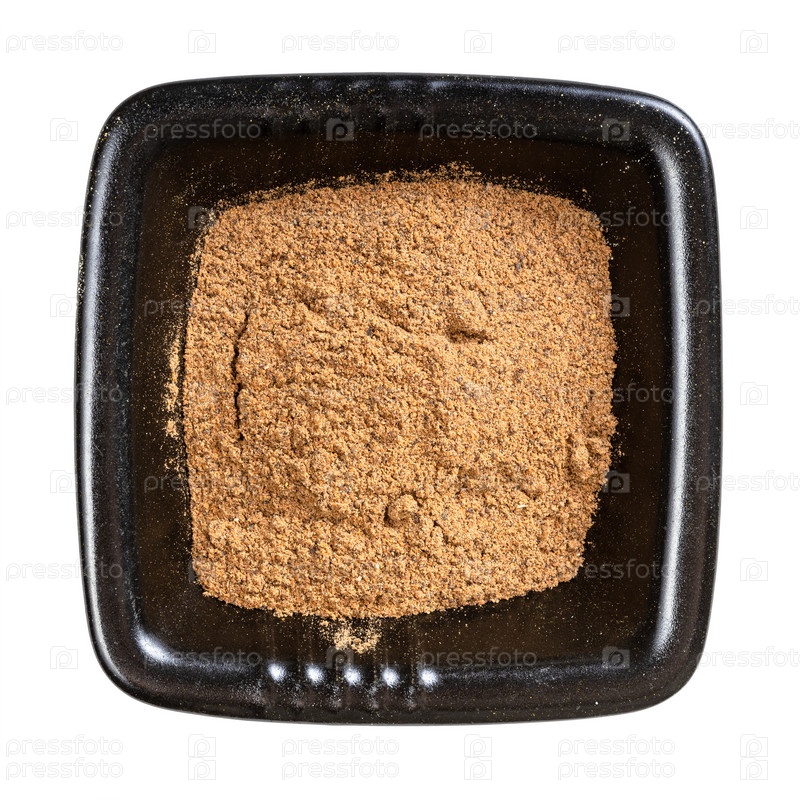 Вид сверху порошка мускатного ореха в черной миске изолирован