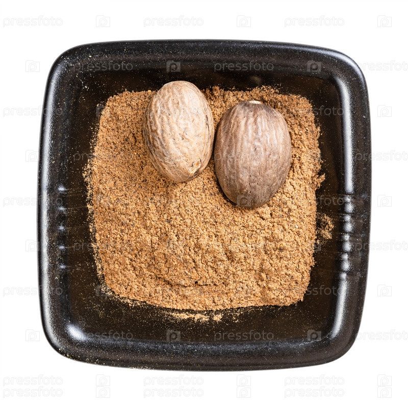 Цельные семена мускатного ореха и порошок в черной миске
