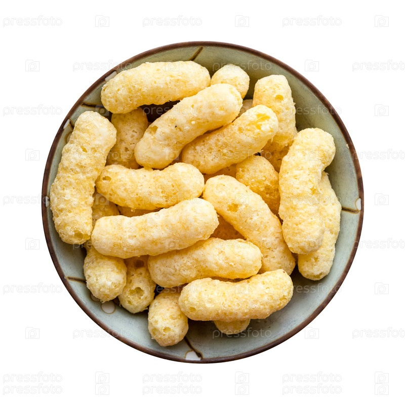 Вид сверху на кукурузные палочки в керамической миске изолирован