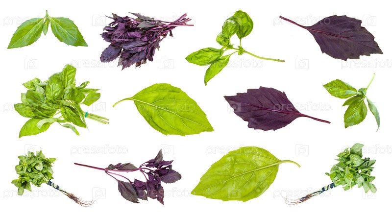 Различные листья и веточки растений базилика изолированы