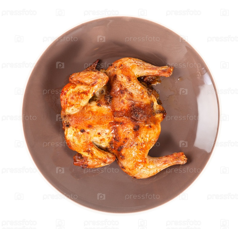 Вид сверху на жареную плоскую курицу на тарелке