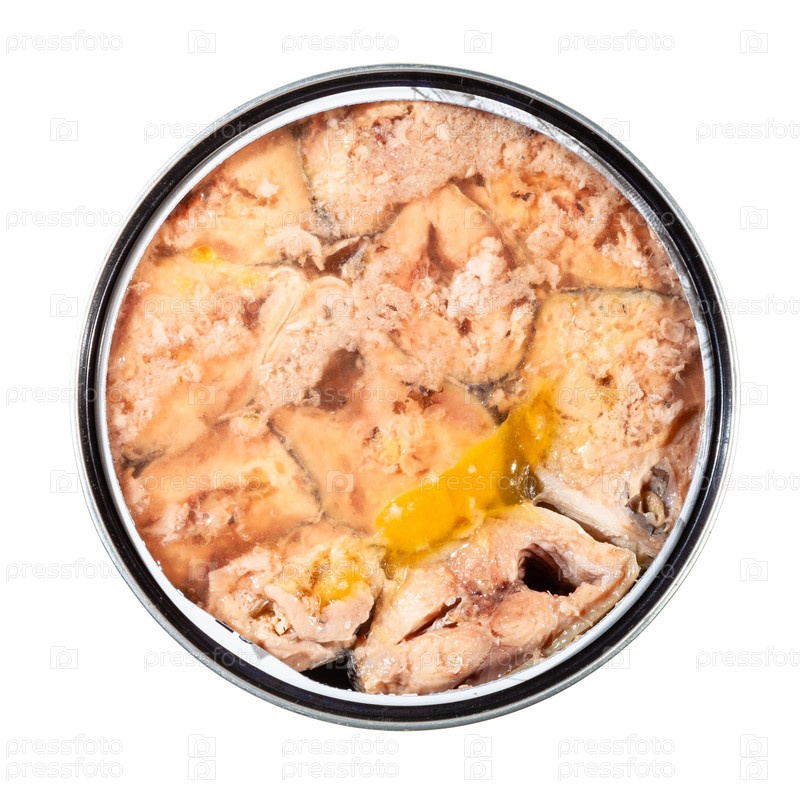 Вид сверху на консервированную рыбу сайры, изолированную на белом
