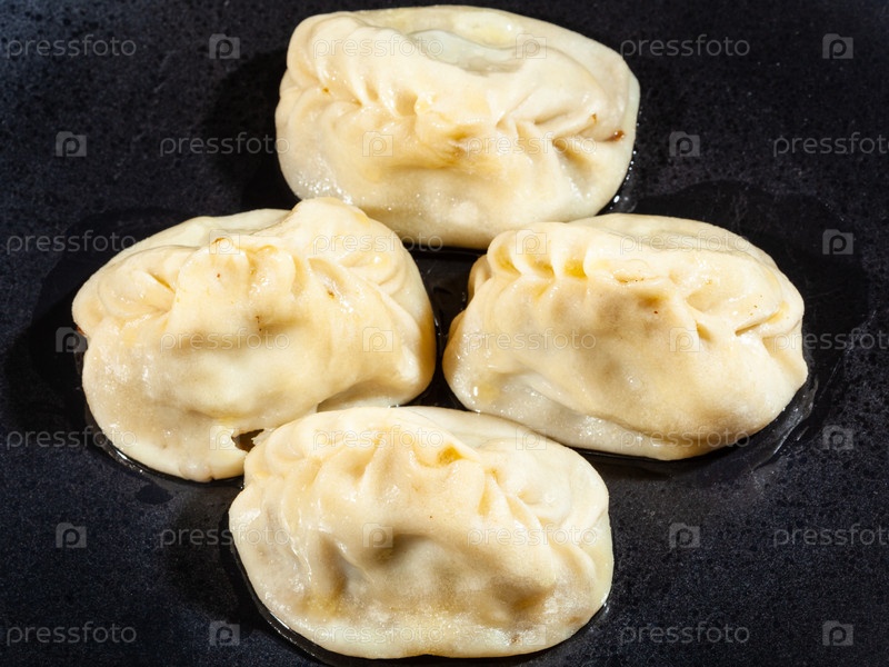 Несколько вареных мантов на черной тарелке