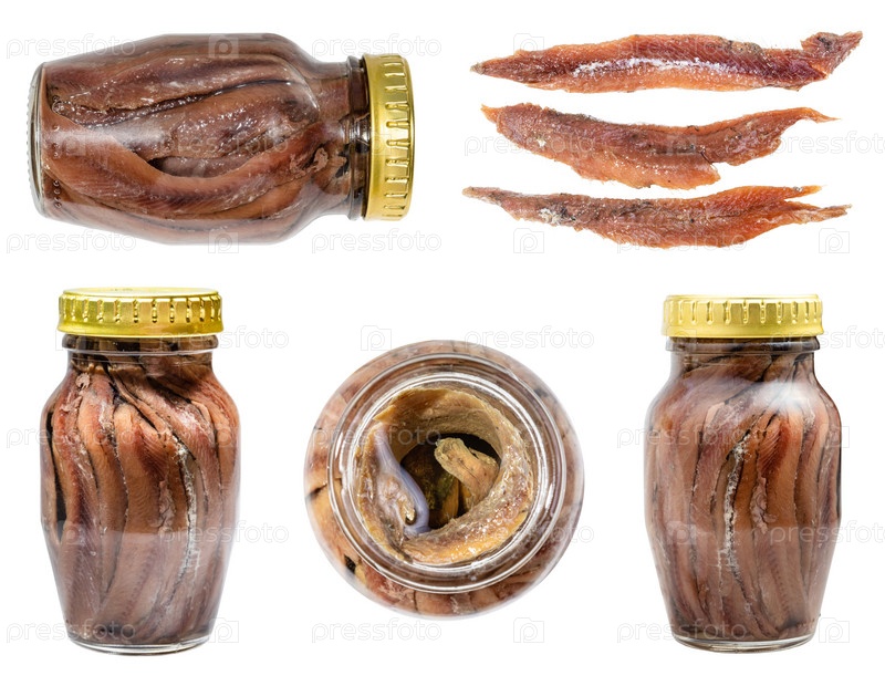 Набор филе анчоуса в масле в стеклянной банке изолирован