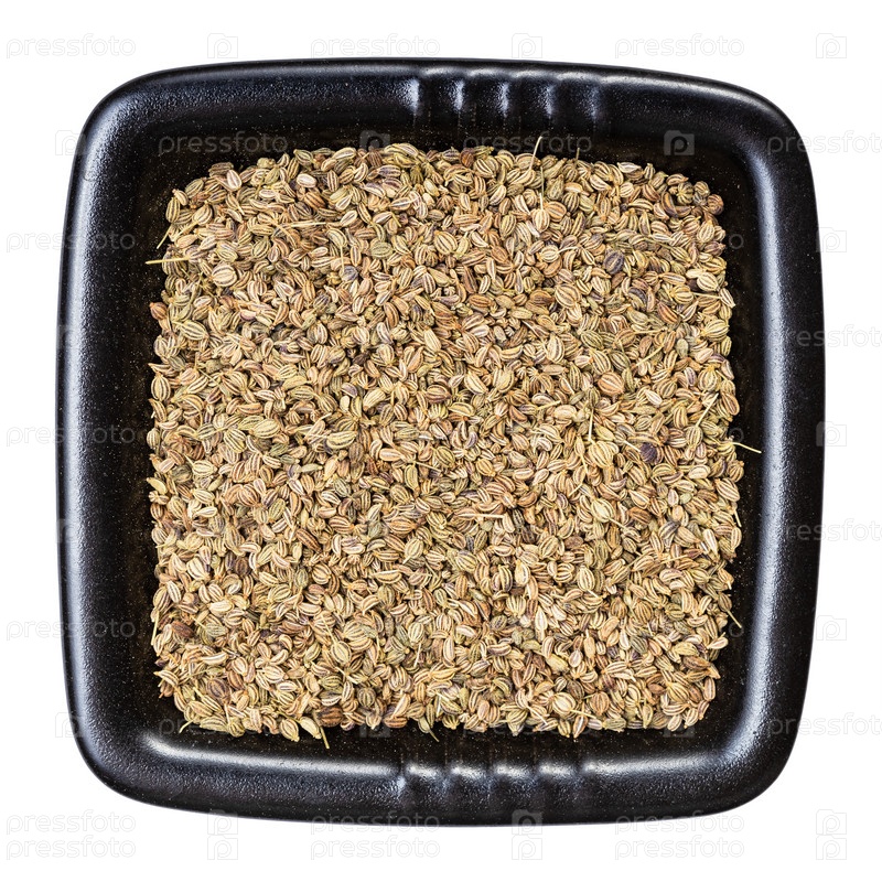 Семена аджвана в черной миске, изолированные на белом фоне