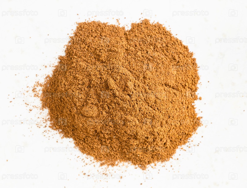 Куча порошка корицы крупным планом на сером