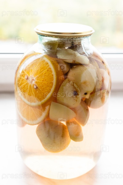 Домашний компот (компот) банка на подоконнике