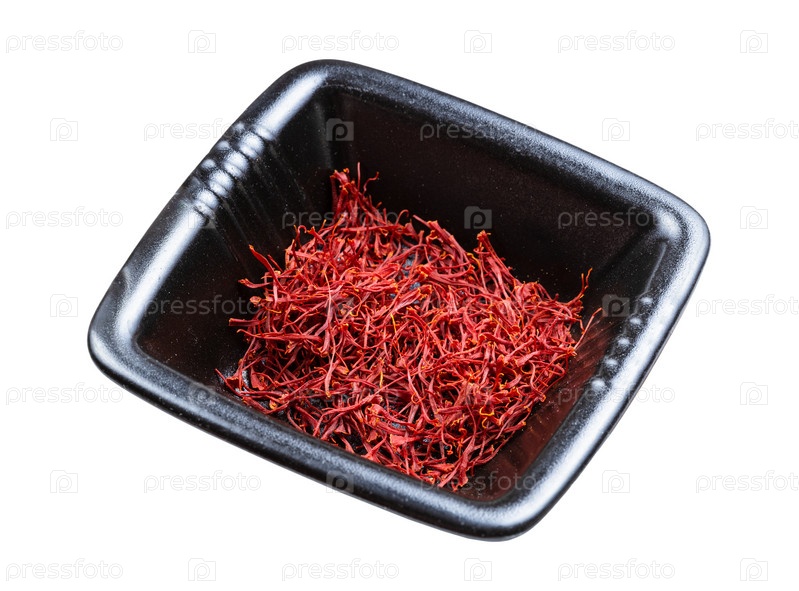 Крокусы шафрановые нити в черной миске изолированы