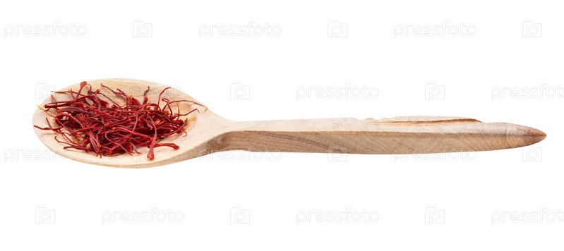 Крокусы шафрановые нити в деревянной ложке изолированы