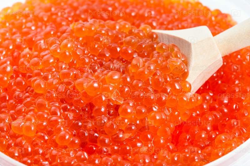 Большая деревянная ложка в соленой русской красной икре