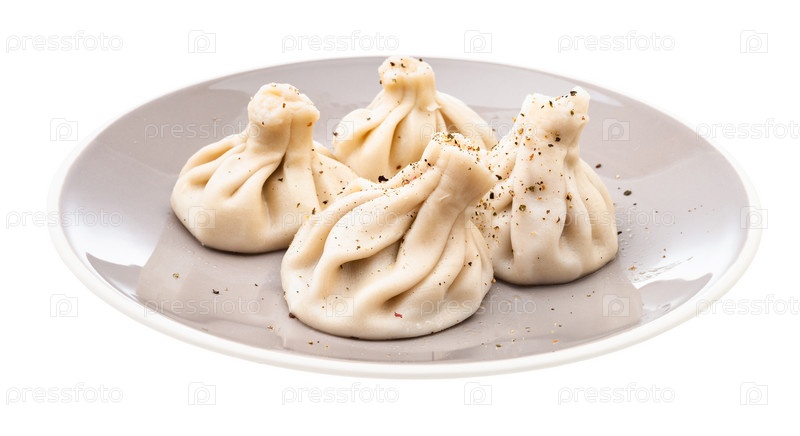 Порция хинкали на серой тарелке изолирована