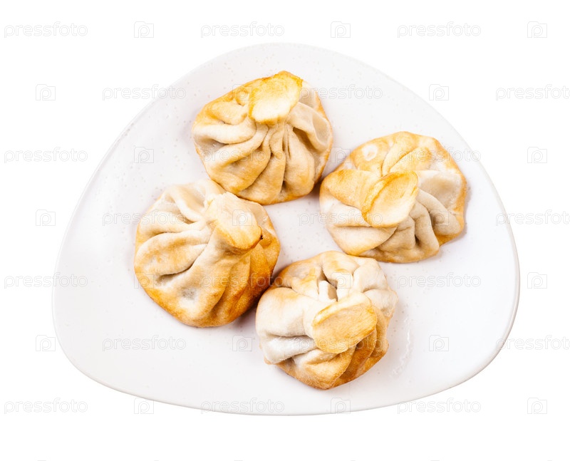 Вид сверху на жареные хинкали на тарелке изолированы