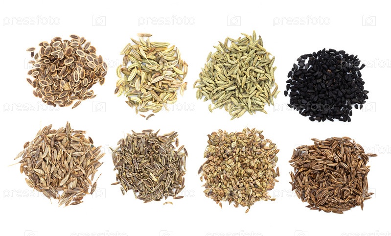 Груды различных тминов, как фрукты на белом