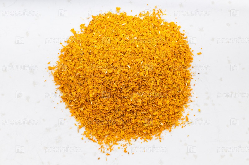 Куча молотых сушеных бархатцев крупным планом на сером