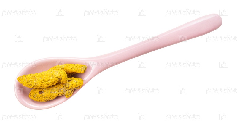 Корни куркумы в керамической ложке изолированы