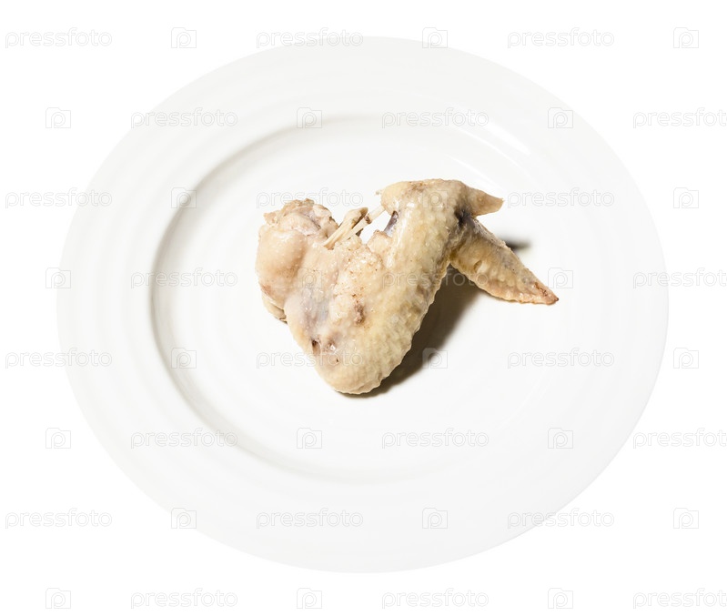 Одно вареное куриное крылышко на белой тарелке изолировано