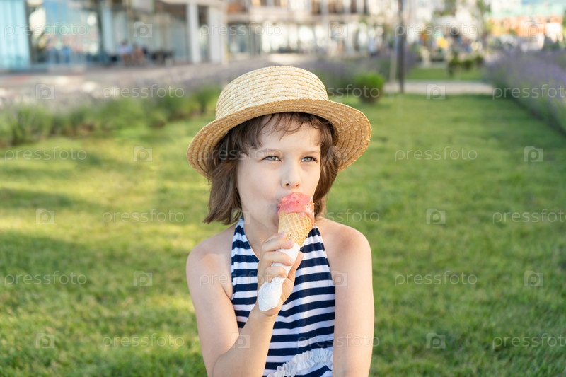 Милая девушка ест мороженое летом. Мороженое в вафельном рожке. Маленькая девочка в шляпе и платье летом наслаждается мороженым