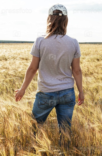 Вид сзади женщина в джинсах среди желтых сухих злаков пшеничное поле сельское хозяйство и урожай зерна макет дружелюбный