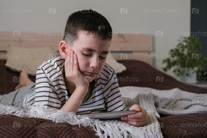 Мальчик лежит на кровати и смотрит мультфильмы и видео на смартфоне