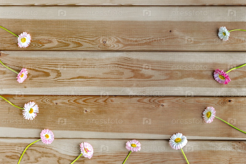 Белые и розовые ромашки на деревянном фоне в форме полукруга. Фон для поздравления. Минимализм. Горизонтальный формат