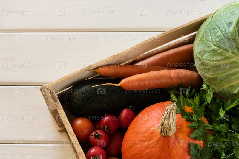Спелые овощи в деревянном ящике на белом фоне
