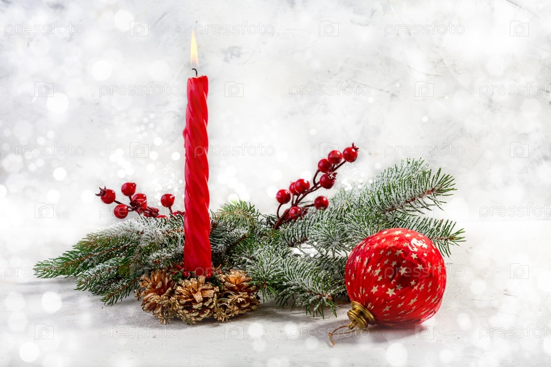Горящая красная свеча со снежными еловыми ветками. Рождественское пришествие
