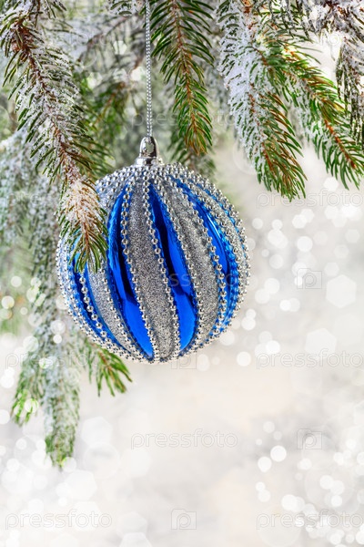 Рождественский синий шар на еловой ветке