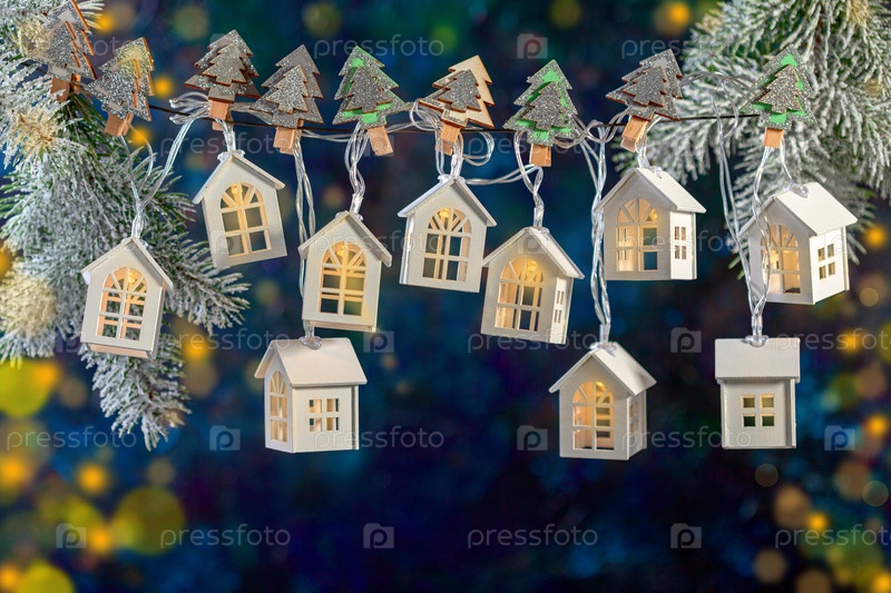 Рождественская гирлянда из огней в виде белых домиков