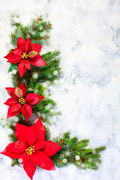 Рождественский цветок пуансеттии с еловыми ветками