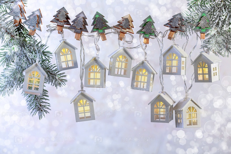 Красивая рождественская гирлянда из огней в виде белых домиков